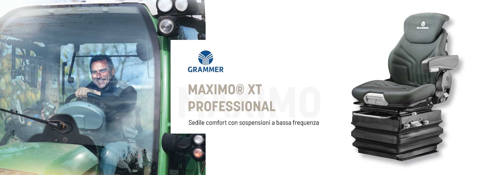 Un sedile di guida confortevole non è un lusso superfluo, ma un investimento prezioso per le vostre prestazioni, sicurezza e salute. I nuovi design con schienali, cuscini e braccioli ergonomicamente ottimizzati offrono un supporto comodo e sicuro, unito alla massima libertà di movimento. Inoltre, un'ampia gamma di opzioni e impostazioni vi consente di adattare il vostro MAXIMO® alle vostre esigenze di comfort individuali e alle esigenze del vostro lavoro. Alcuni sedili MAXIMO® sono ora disponibili anche nella versione XT con sospensioni più ampie e la possibilità di montare un bracciolo multifunzione. Ciò che non è cambiato, tuttavia, è l'elevata robustezza e durata su cui avete sempre potuto contare con i sedili GRAMMER.